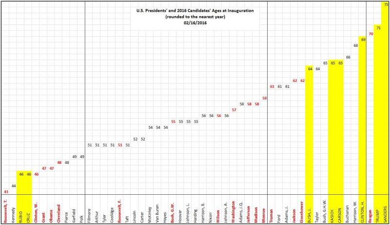 But in 2016, now that we're down to seven candidates (Carson, Cruz, Kasich, Rubio, and Trump vs. Clinton and Sanders), not a single candidate is in his or her 50s.