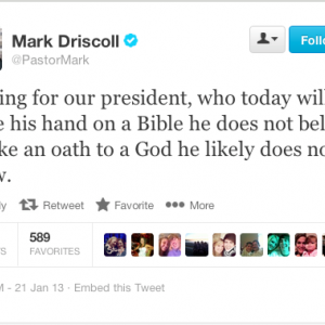On the Monday, before President Obama’s inauguration ceremony, Driscoll sent out the following message to his more than 300,000 Twitter followers: