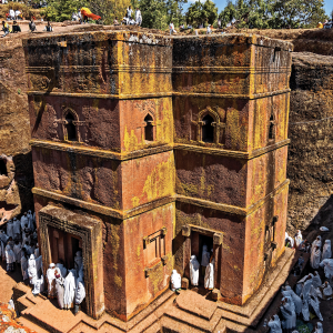 Detailing her experience in her book Airplane Mode, a personal history of travel with a sharp eye for the colonial legacies in tourism, Habib calls Lalibela’s churches “marvels of subterranean engineering.” Carved from red volcanic rock, they sit embedded in the ground, connected by tunnels. The complex of structures was built in the 12th century as an homage to Jerusalem, complete with replicas of Christ’s Nativity crib and tomb.