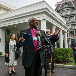Bishop Michael Curry, the presiding bishop of the Episcopal Church, speaks to the media on Sept., 22, 2021, following a meeting between a coalition of Christian denominations and the White House to discuss investments in anti-poverty initiatives and programs that support children and families. REUTERS/Evelyn Hockstein