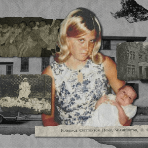 A collage of photos made by Tiarra Lucas/Sojourners. In center, Karen Wilson-Buterbaugh with her daughter at the Florence Crittenton Home in Washington, D.C., ten days after she was born on July 22, 1966. Courtesy Karen Wilson-Buterbaugh. Upper- and Bottom-left, photos of several babies in maternity homes (location unknown). Courtesy the Social Welfare History Archives, University of Minnesota Libraries. Background image, St. Faith’s House, in New York, in 1983. Courtesy Westchester County Historical Society.