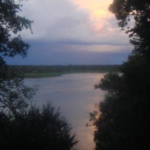 Ironically, one of the last and longest, most peaceful and unpolluted rivers in the world is the Okavango. It is the border between Namibia and Angola where still today a long stretch of the north bank Angolan farmland is mine infested. Large breem and tiger fish jump, and magnificent fish eagles take flight from trees on the Namibian bank and wing to large dead trees in Angola where hippo provide background music with loud braying. The behemoths make their way back and forth and often spend the early evening hours lounging on the beach in front of the main buildings of the River Dance Lodge near Divindu on the southern shore.