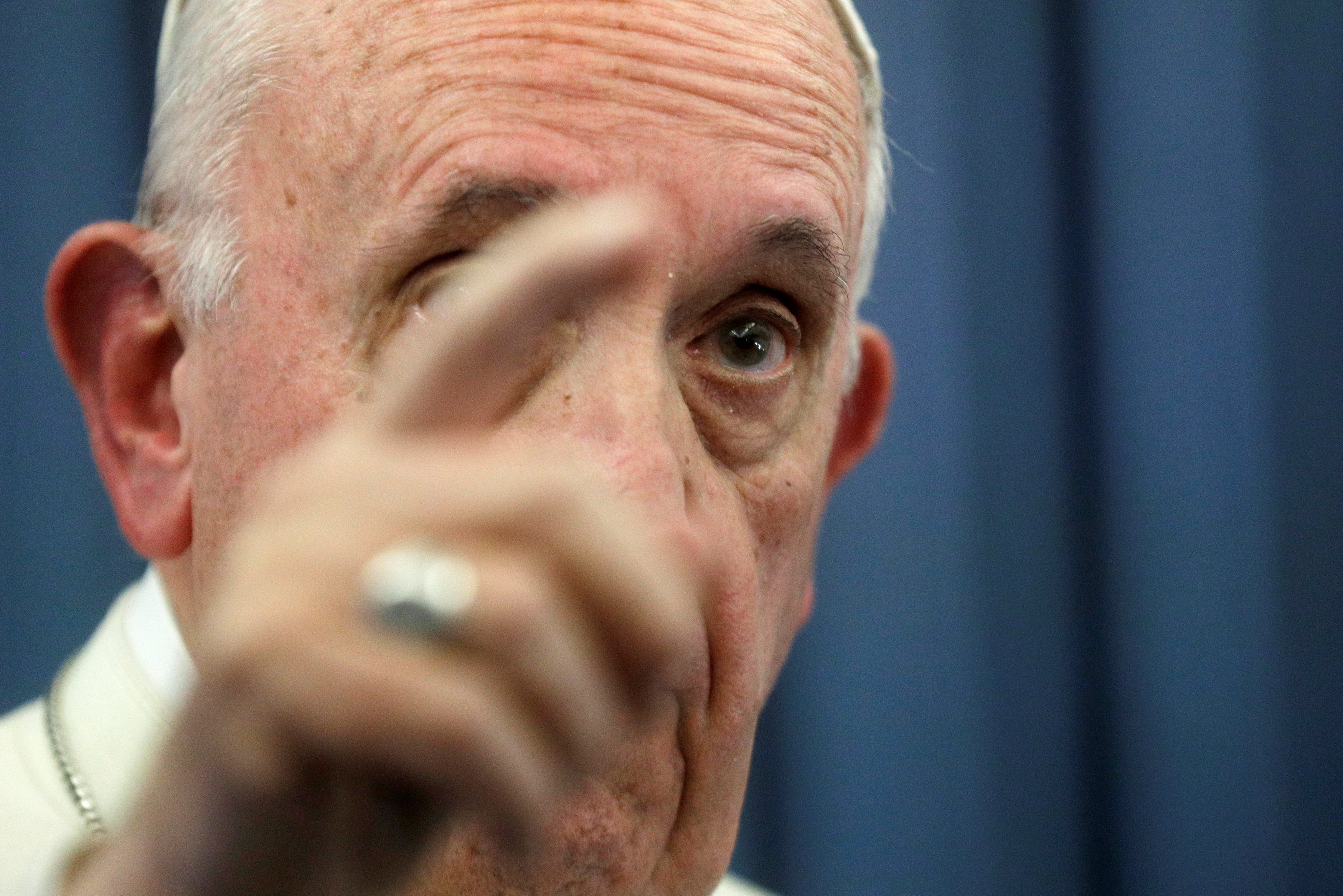 Pope Francis speaks with the media onboard a plane during his flight back from a trip in Dublin, Ireland. Aug, 26, 2018. Gregorio Borgia/Pool via REUTERS