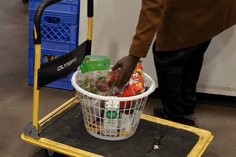 An individual at HOPE Food Pantry in Nacogdoches, Texas, collects food on Nov. 3, 2025. Deidra Harrison, HOPE’s board president, told Sojourners that as lines at HOPE get longer, rising grocery prices means a “lack of availability of foods that are affordable for the pantry to purchase is growing.” Photo by Reid Bader/Sojourners.