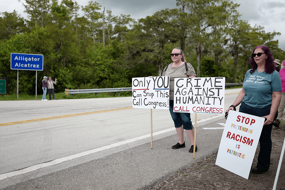 A weekly interfaith vigil continues outside the Alligator Alcatraz Immigration Detention Center after a federal appeals court temporarily blocked a court order that would have closed the facility. Lisette Morales/ZUMA Press Wire/dpa via Reuters Connect