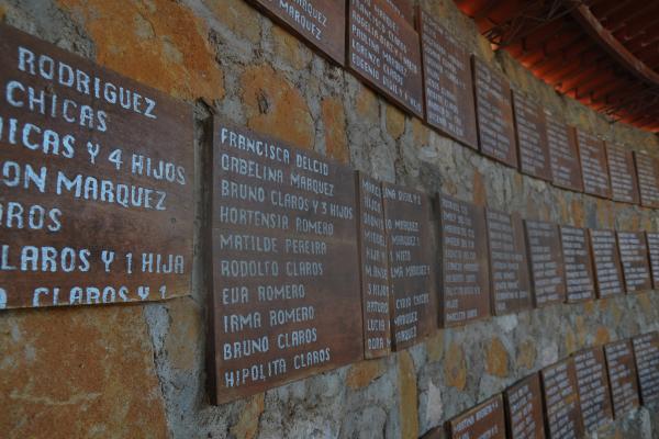 As we drove past the Rio Sapo and into the village, a few children approached the car. They were eager to show us the memorials and take us to the pits where the Argentine Forensic Anthropology Unit had unearthed bodies and bone fragments with strips of cloth still attached. Especially they wanted to show us the plaque placed over the mass grave of 140 children and take us through the rose garden planted in their memory. There is also a rough curved stone wall, not too far from the church, on which the names of the dead are written. It’s watched over by the iron silhouette of a family.