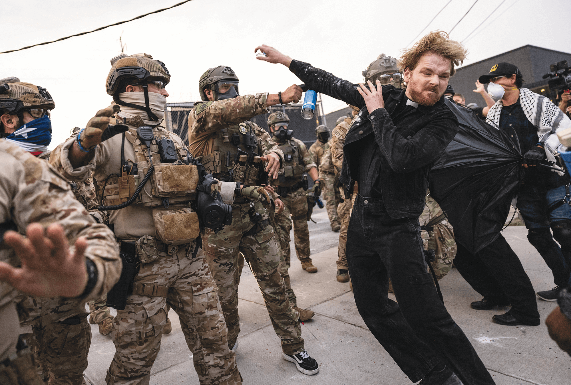 I WAS NEVER the smartest seminarian, but I read my Bible every day. I feel rooted in the scriptures and formed by what I see Jesus teaching us and how he’s calling us to imitate him. I was moved in that moment to pray in the verbatim words of Jesus, to warn the ICE officers who were standing on the roof about the spiritual consequences of their actions in language that was not just me—[it] was an echo of scriptural prophetic language talking about how generations after them would view their actions and calling them to repent.