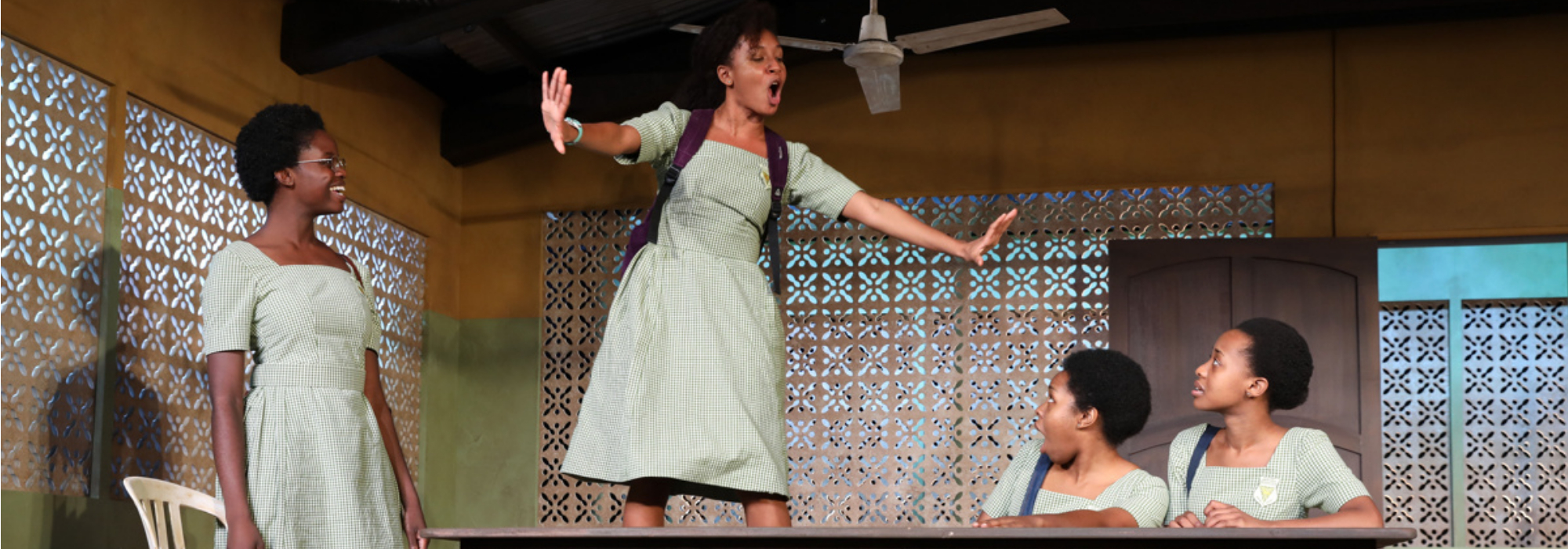 School Girls; Or, The African Mean Girls Play , by Jocelyn Bioh, is a dizzying romp through nasty coming-of-age teen dramedy that pays homage to Tina Fey’s classic Mean Girls. Taking place in a Ghanaian girl’s boarding school during the 1980s, Bioh’s first full-length play addresses cruel, clique-ish competition among adolescents using the template of the American genre, yet something fresh emerges. The story follows the queen of the school, Paulina (MaameYaa Boafo), as she vies to be named Miss Ghana and participate in the Miss Universe pageant.