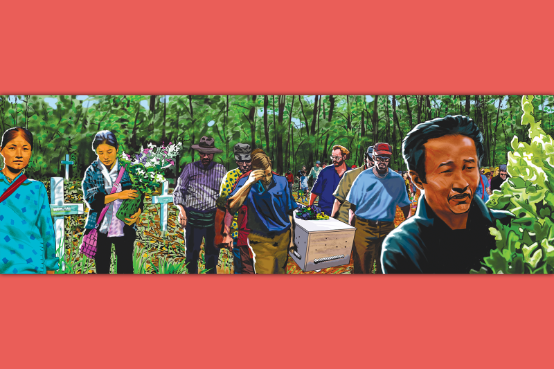 At her burial, I took a first and final look at Poe Ker Lay’s face. It bore no mark of an undertaker’s professional touch; she looked dead. My 3-year-old daughter, safe in her father’s arms, looked at our neighbor’s sunken cheeks and ashy skin while congregants sang and recited a final prayer. They slid the coffin lid back on and nailed it firmly in place. I looked up at the lattice of pine branches above and over to my young daughter, who seemed unperturbed by this, her first glimpse of human death. Six men, like sailors, gripped the heavy line as they lowered the coffin, hand over hand, until it hit ground. Everyone present tossed in fistfuls of dirt or grabbed a shovel to fill the hole.