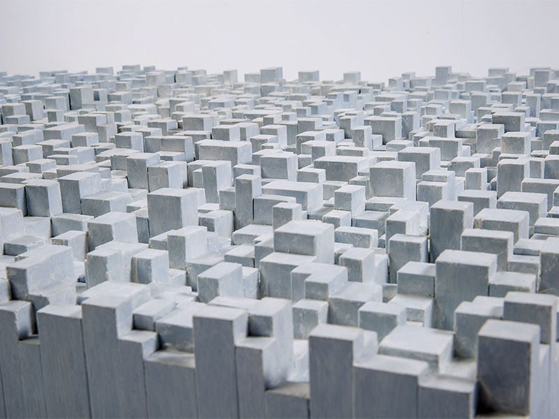 The piece by Kahn, titled “M’AHL,” is a sculpture meant to be viewed from above. Measuring 80 by 42 inches, it is a floor relief made up of thousands of blocks of wood remnants that evoke the view of the city skyline from the top of the World Trade Center.