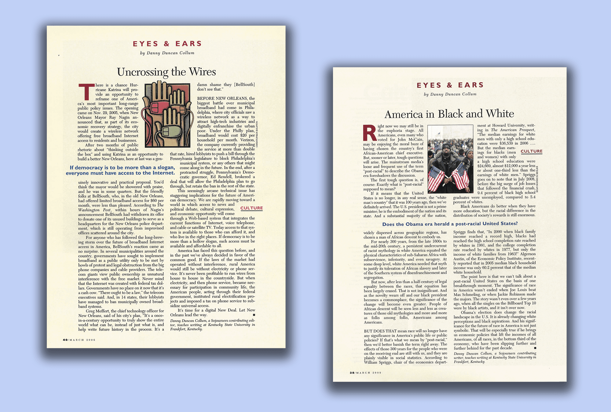 "Eyes & Ears" columns from Sojourners, March 2006 and March 2009.